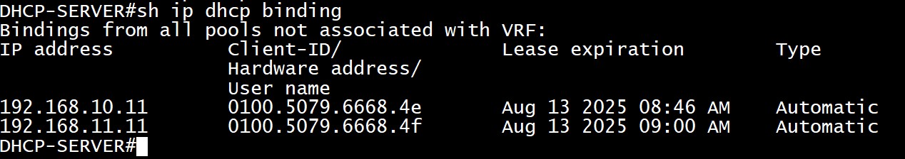 - 바인딩 확인: show ip dhcp binding