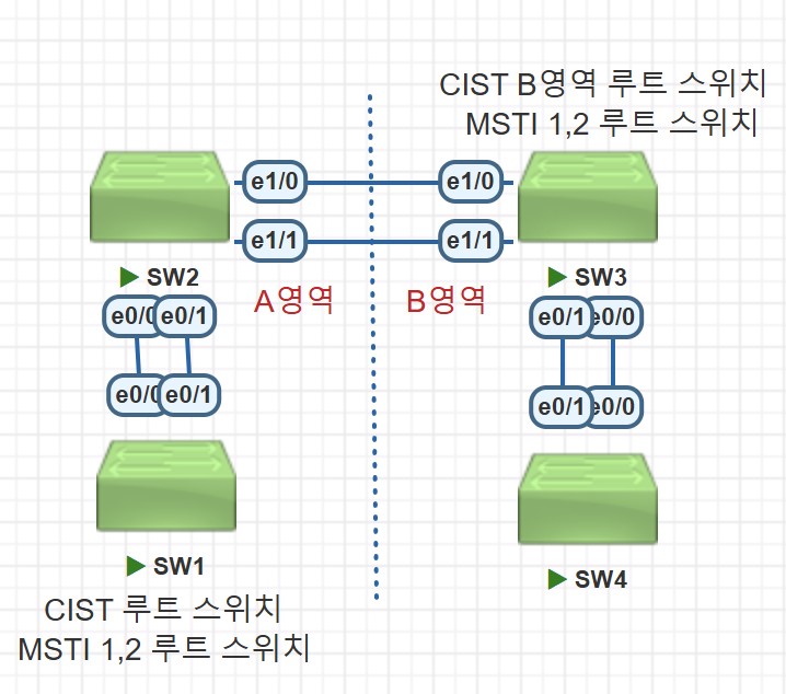 CIST Root 스위치(전체 스위치에서 하나) 와 CIST 영역별 Root 스위치(영역 별로)를 가진다.(아래 사진 참조)