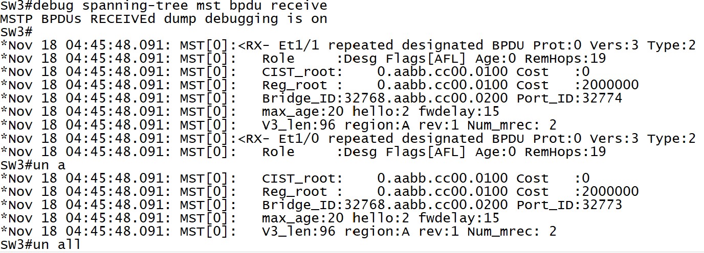 SW3이 받는 mst bpdu를 debug한 사진인데, MST[1],MST[2] 정보를 제외한 MST[0]에 대한 bpdu만 받는 모습니다.