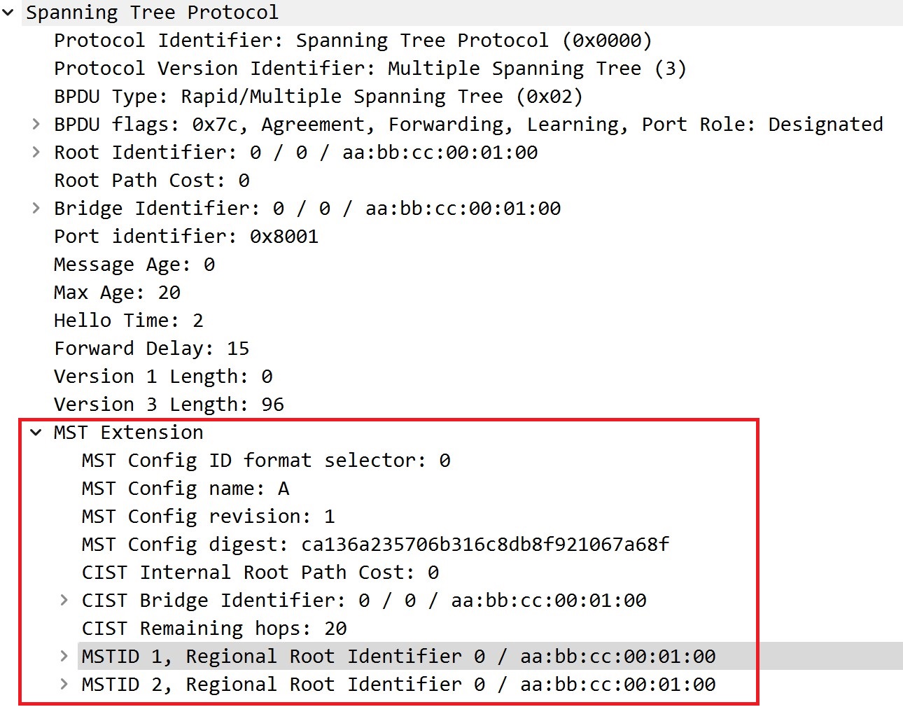 MST 영역 이름(Region Name), Revision Number, VLAN 매핑 정보를 포함.