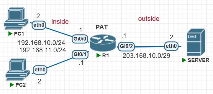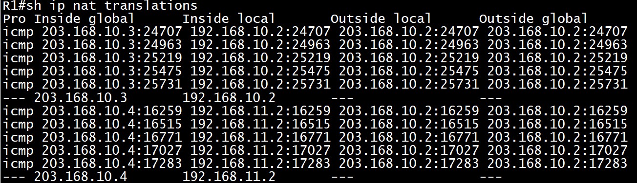 - 실제 검증은 show ip nat translations 로 두 엔트리가 같은 inside global 주소지만 포트가 서로 다름을 확인하면 된다.