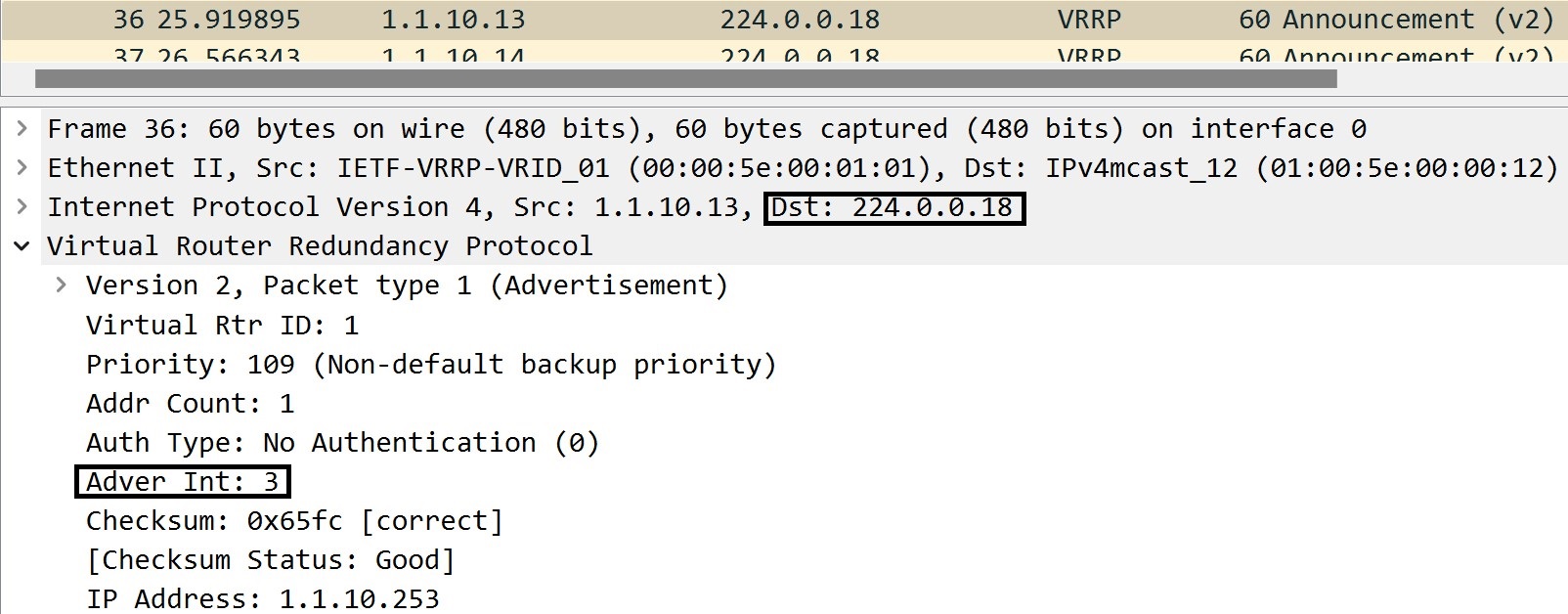 또, HSRP에서는 멀티캐스틀 주소가 224.0.0.2 였었는데 VRRP에서는 224.0.0.18인 것을 확인할 수 있다.