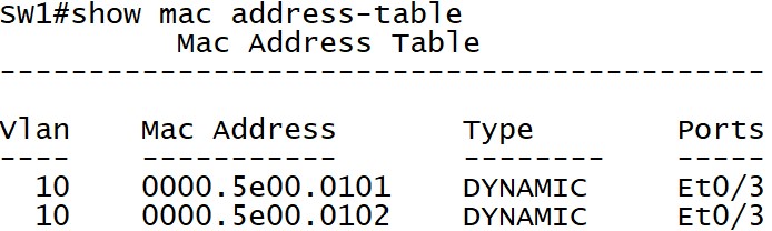 당연히 SW1 Mac table도 VRRP 그룹1 경로가 e0/2 -> e0/3 으로 바뀐 모습니다.(아래 그림 참조)