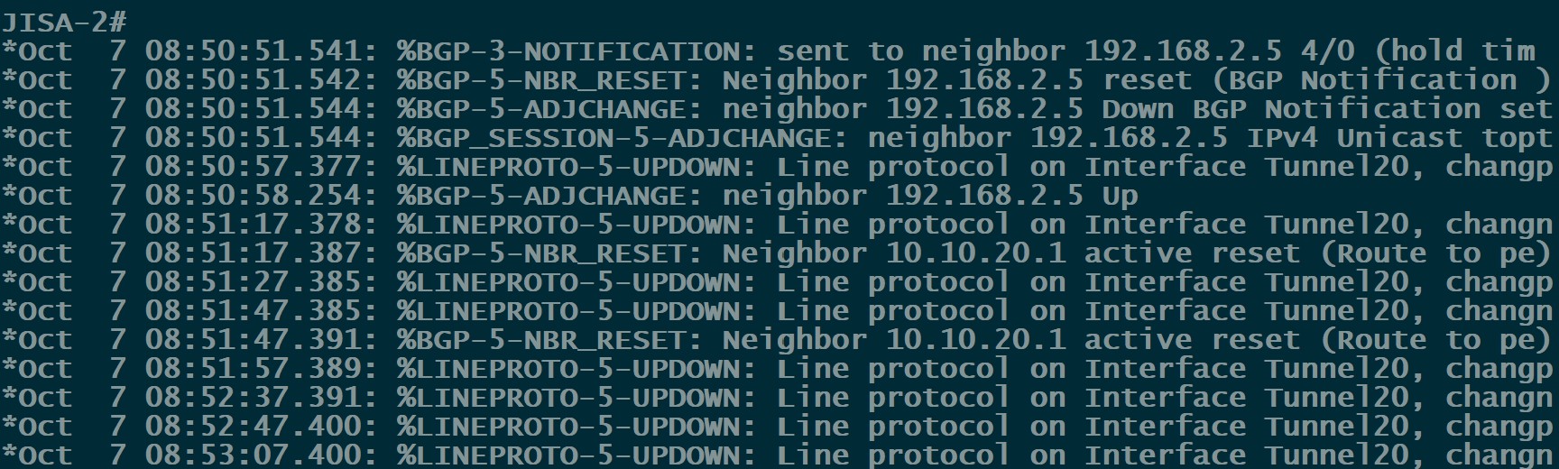 - JISA-2 라우터의 Tunnel20 인터페이스가 주기적으로 up/down 상태를 반복.